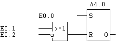 Vom Inneren einer SPS aus werden die Eingänge als Bedingungen gesehen, die entweder “wahr” oder “falsch” (meist mit “1” und “0” abgekürzt) sein können. “1” bedeutet dabei immer: “Am Eingang liegt Spannung an”. Die Bedeutung eines Signals, dass über einen Eingang in die SPS gelangt, ist damit aber noch nicht festgelegt. Bei einem Eingang, der mit “Not-Aus” beschriftet ist, z.B. bedeutet eine “1”: “alles in Ordnung, Maschine kann laufen”. (Siehe: Sicherheitsüberlegungen). Verwendet man diesen Eingang im SPS-Programm, muss man seine Bedeutung berücksichtigen. Denken Sie sich einen Motor (angeschlossen an den Ausgang A4.0), der durch einen EIN-Taster (E0.0) gestartet und durch einen AUS-Taster (E0.1) gestoppt werden soll. Außerdem gibt es noch einen Not-Aus-Kreis, der an den Eingang E0.2 angeschlossen ist. Natürlich soll der Motor auch gestoppt werden, wenn Not-Aus ausgelöst worden ist (E0.2=0).