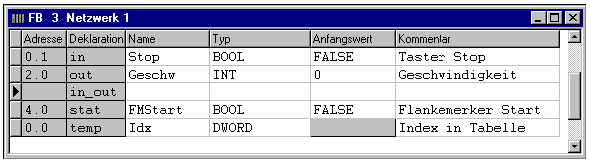 In der ersten Spalte wird die automatisch bestimmte Adresse angezeigt. Ein neuer Deklarationstyp beginnt immer auf einer geraden Adresse. Bei Funktionsbausteinen beginnt die Nummerierung der temporären Variablen wieder bei Null, da diese Variablen nicht gemeinsam mit den anderen Werten im Instanz-DB, sondern auf dem Stack gespeichert werden.