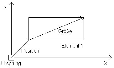 Alle quaderförmigen Elemente haben eine Position (Ausnahmen sind die Linienförmigen wie Linearbeweger und Lichtschranke). Die Position bezeichnet die dem Ursprung am nächsten liegende Ecke. Sie wird normalerweise in absoluten Koordinaten bezüglich des Ursprungs angegeben, dies können Sie jedoch mit dem Kreuz ändern.