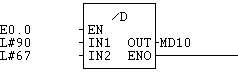 Akku 2 wird durch Akku 1 dividiert und das Ergebnis im Akku 1 abgespeichert. Der Rest geht verloren. Solange die Werte in Akku 1 und Akku 2 positiv sind, ist es gleichgültig, ob sie aus einem Word oder aus einem DWord geladen wurden. Könnte jedoch einer der als Word geladenen Operanden negativ sein, wird “/D” zu einem unsinnigen Ergebnis führen. In diesem Fall muss der evtl. negative Operand vor der Division mit ITD auf das DWord-Format erweitert werden.