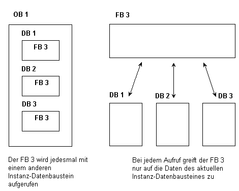 Funktionsbausteine gleichen in vielem den Funktionen. Der Unterschied zwischen diesen beiden besteht darin, dass beim Aufruf eines Funktionsbausteines (fast) immer ein Datenbaustein angegeben wird, in dem die Daten stehen, mit denen der Baustein arbeiten soll. Dieser Datenbaustein wird Instanz-Datenbaustein genannt. Seine Struktur wird bei der Programmierung des FB’s festgelegt und auf seine Daten kann innerhalb des FB’s besonders komfortabel zugegriffen werden.