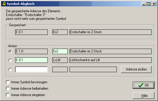 Diese Meldung erscheint gelegentlich beim Laden eines Projektes, wenn es Unstimmigkeiten zwischen der gespeicherten absoluten Adresse und dem Symbol eines Operanden gibt.
