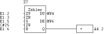 Wenn am Eingang ZV eine steigende Flanke auftritt, wird der Zähl-Wert um 1 erhöht. Wenn am Eingang ZR eine steigende Flanke auftritt, wird der Zähl-Wert um 1 erniedrigt. Wenn am Eingang S eine steigende Flanke auftritt, wird der Zähl-Wert auf den am Eingang ZW anliegenden Wert gesetzt. Wenn am Eingang R eine “1” anliegt, wird der Zähler statisch auf 0 gesetzt, d.h., nicht nur bei einer Flanke. Am Ausgang DU wird der aktuelle Zähl-Wert dualcodiert in eine beliebige Word-Variable geschrieben. Am Ausgang DE wird der Zählwert BCD-codiert in eine beliebige Word-Variable geschrieben. In dieser Form kann er direkt wiederverwendet werden, um einem weiteren Zähler als ZW-Wert zu dienen. Der Ausgang Q führt eine “1”, wenn der Zählwert > 0 ist.